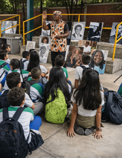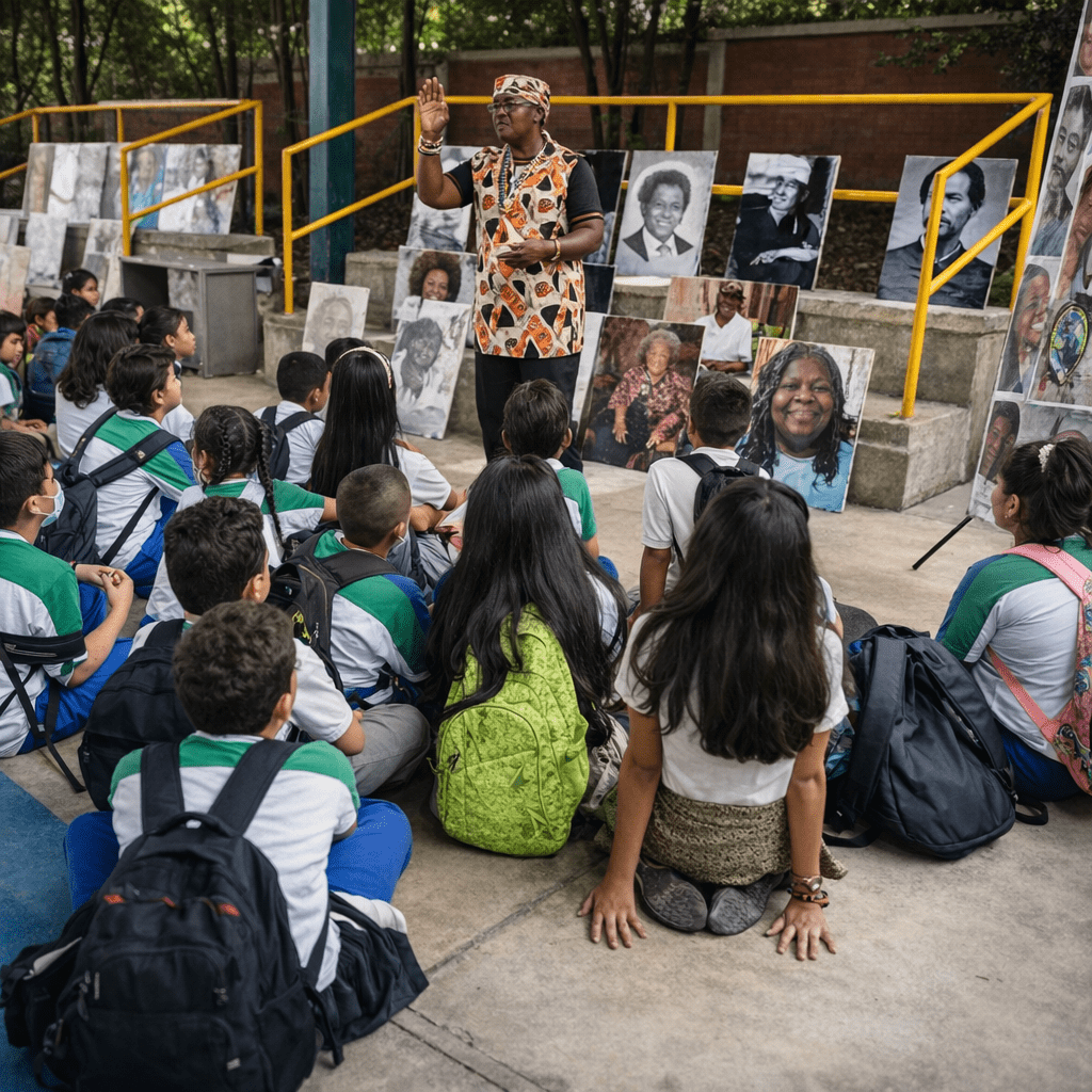 Orlando Sánchez Lasso orienta a estudiantes de primaria durante una exposición sobre cultura afrocolombiana, uno de los procesos pedagógicos que impulsa desde AfroYumbo para fortalecer la identidad y la memoria en las nuevas generaciones.
